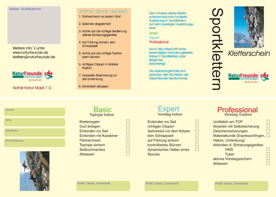 Beim Klettern sind die meisten Unfälle auf Sicherungsfehler zurückzuführen. Mit dem Kletterschein Sportklettern wollen wir einen Beitrag zur Sicherheit dieser Sportart leisten. Durch gute Schulung und Dokumentation des Ausbildungsstandes können Unfälle vermieden werden.
